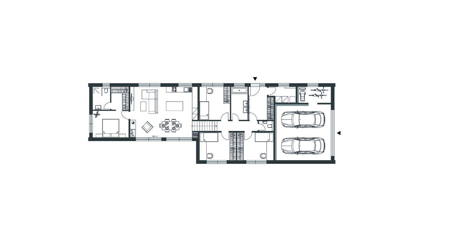 Kompozice domu je rozdělena do dvou lineárně navazujících částí se sedlovými střechami a různou úrovní podlah. Při pohledu z ulice přítomnost rodinného domu prozrazují jen vrata dvougaráže, hlavní vstup do domu je z boku. Následuje zádveří, středová chodba, tři dětské pokoje, koupelna a technická místnost.
