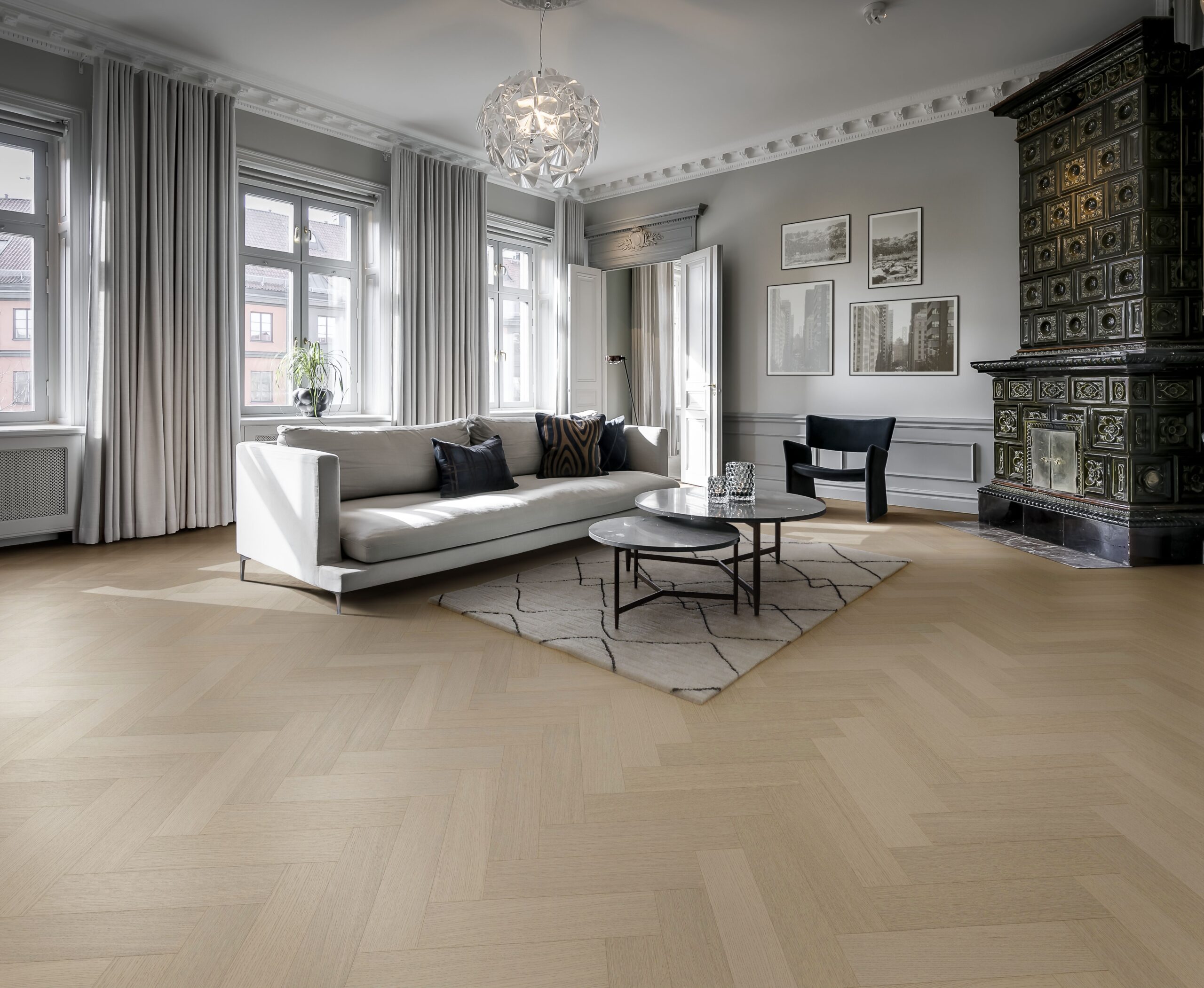 Podlaha s kartáčovanou povrchovou úpravou v ultra matném laku a jemným mořením do odstínu bílé, dodá prostoru nadčasovou eleganci. Chce se říci, že je díky ženšenu v názvu imunní vůči času a módním vlnám. Klasický stromečkový vzor dodává podlaze hloubku, zatímco přírodní textura a jemné barevné moření dotváří klidný a moderní design krytiny, která do vašeho domova vnese rovnováhu.