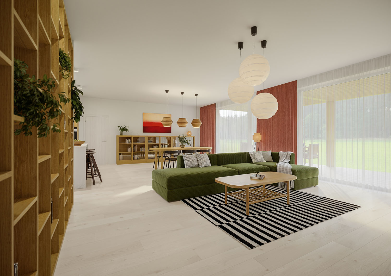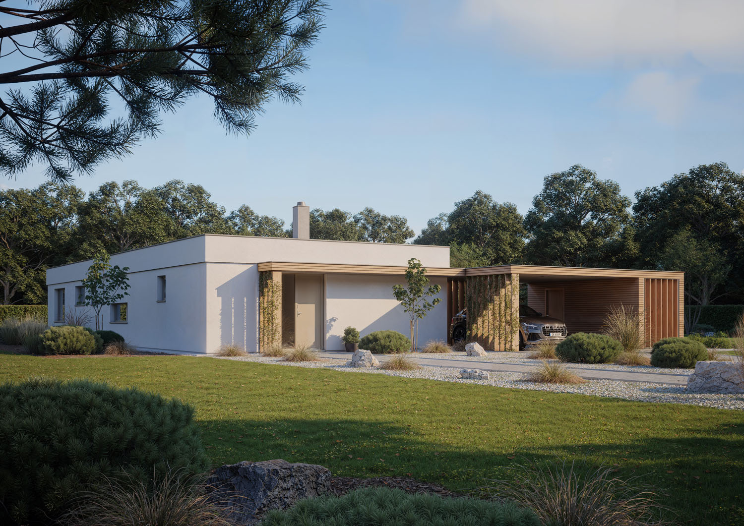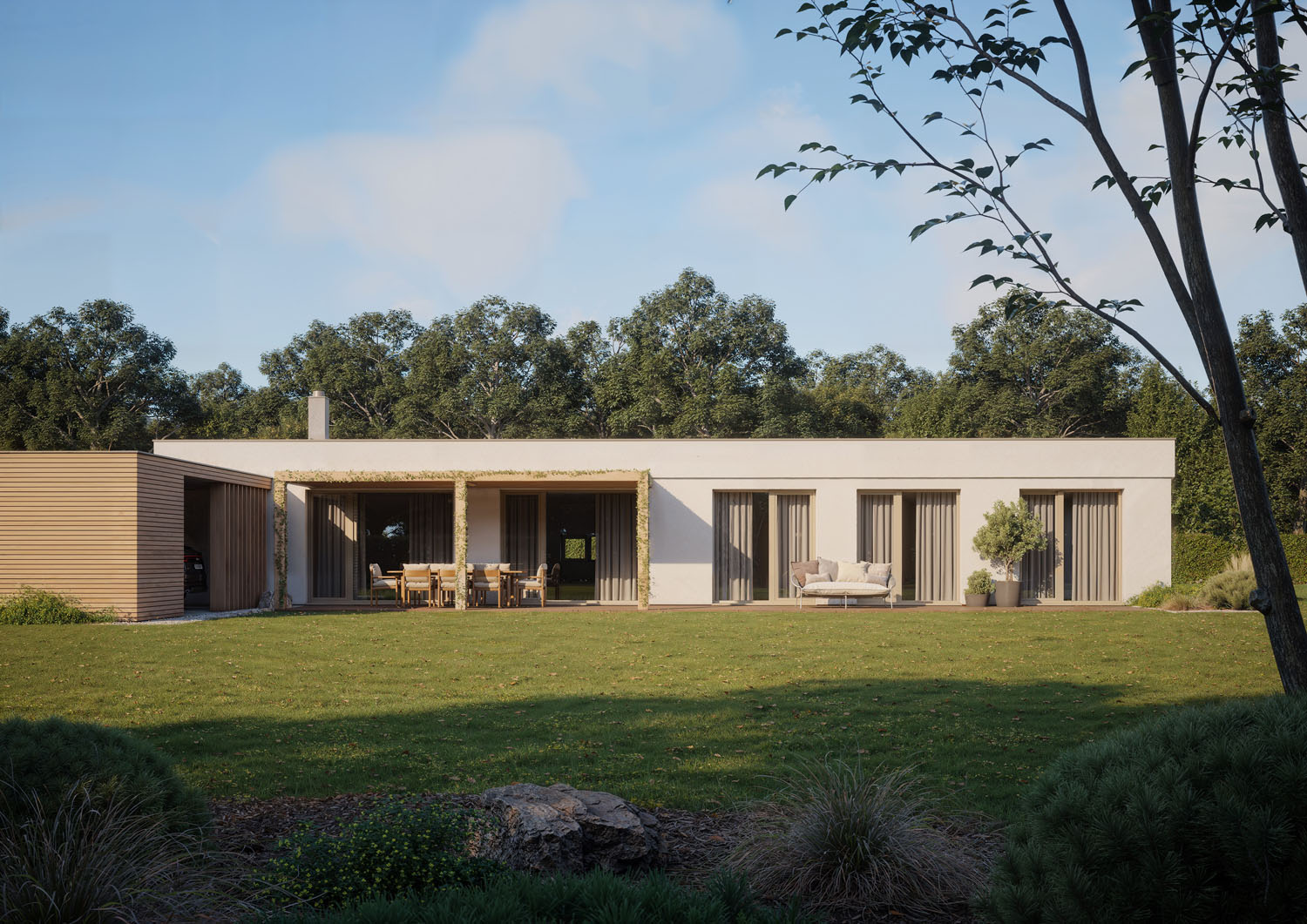 Srdcem domu je prostorný obývací pokoj s kuchyní a jídelnou, který je díky dvěma velkorysým portálům propojen s terasou, chráněnou elegantní pergolou. Na terasu mají přístup i dva dětské pokoje a ložnice rodičů, propojení se zahradou je tak dokonalé, a především v letních měsících dodává domovu zcela nový rozměr. V Elementu se nacházejí dvě koupelny a další obytná místnost, která může sloužit jako pracovna, pokoj hostů nebo třetí dětský pokoj.