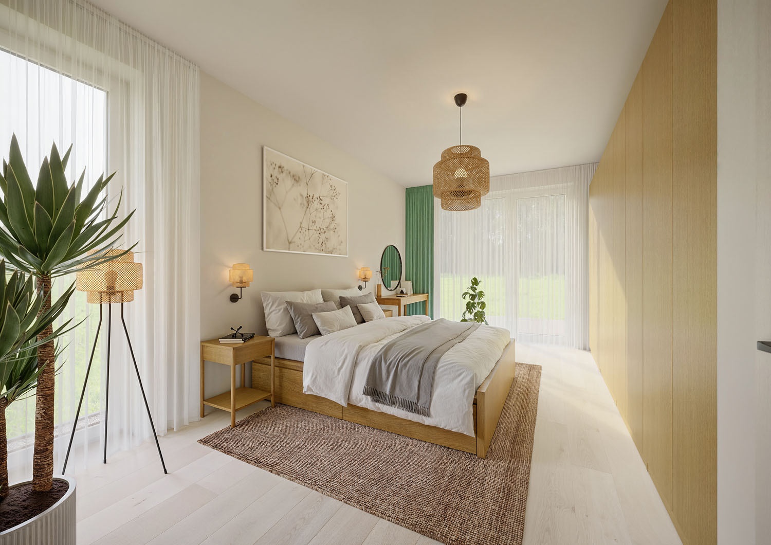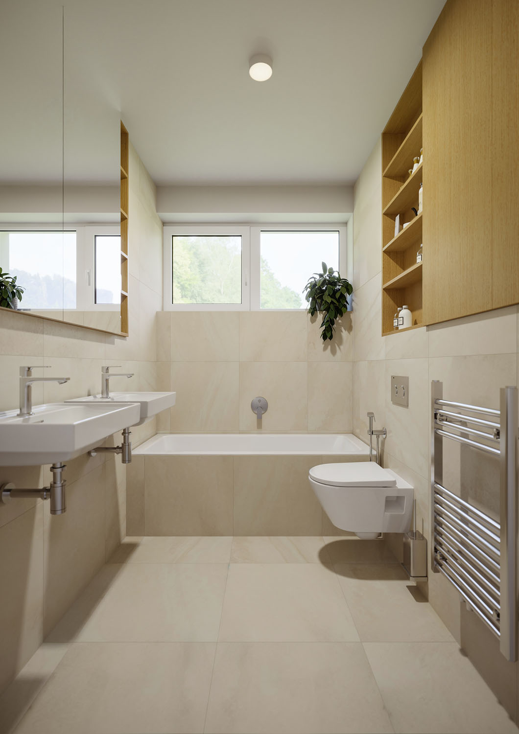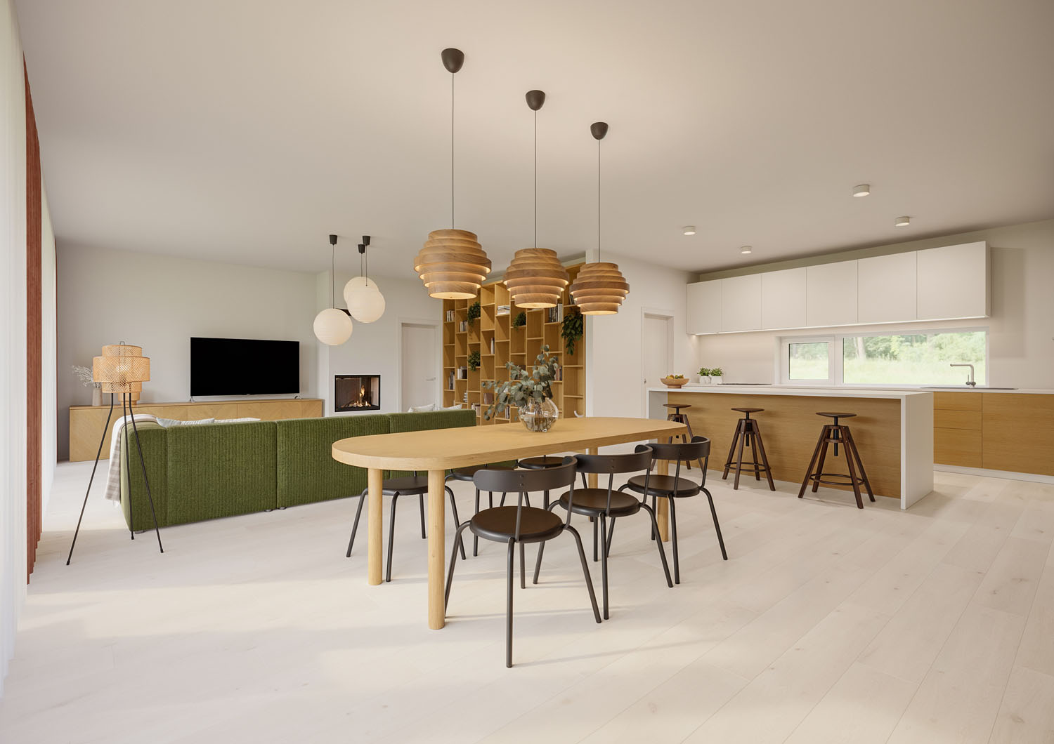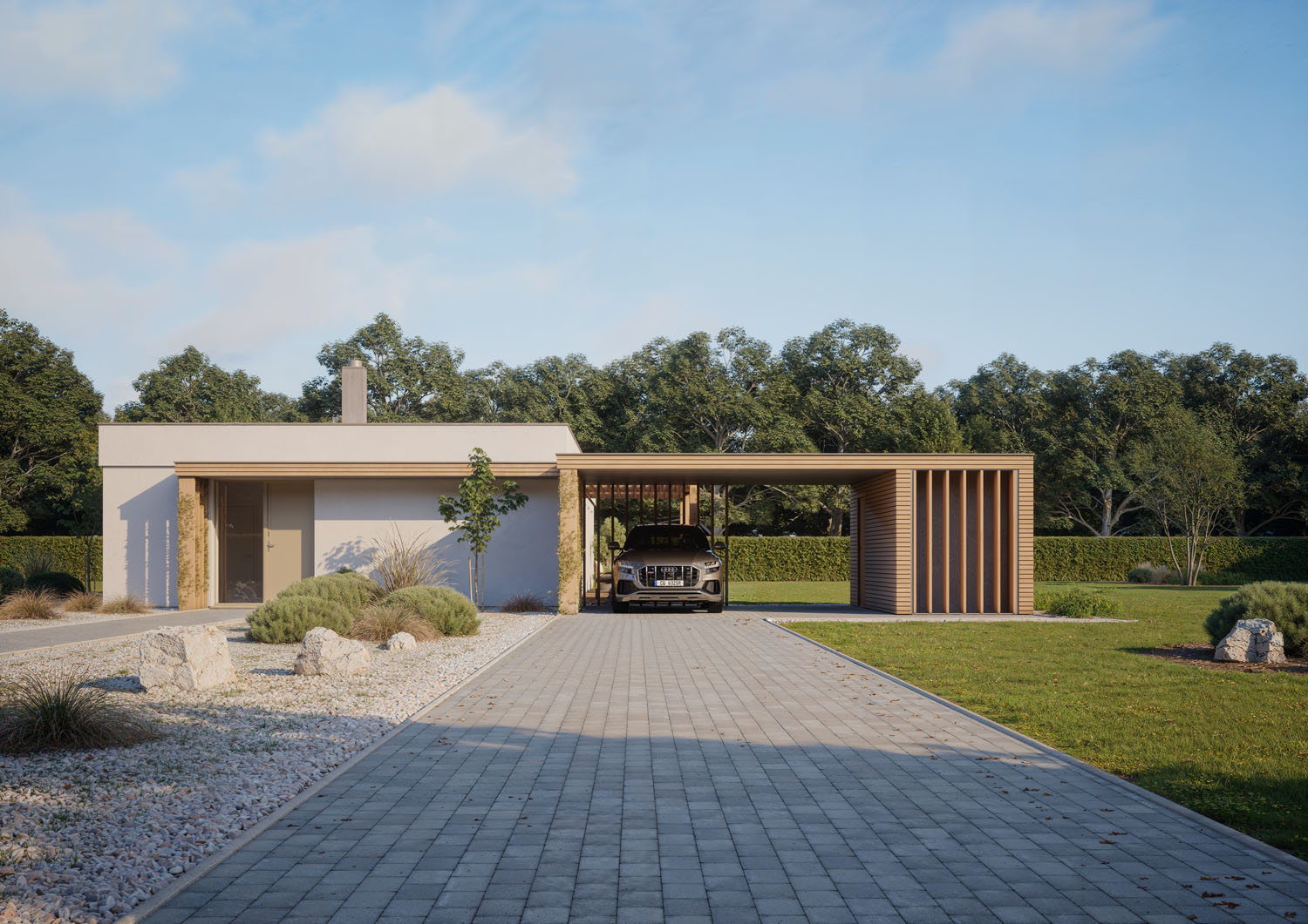 Srdcem domu je prostorný obývací pokoj s kuchyní a jídelnou, který je díky dvěma velkorysým portálům propojen s terasou, chráněnou elegantní pergolou. Na terasu mají přístup i dva dětské pokoje a ložnice rodičů, propojení se zahradou je tak dokonalé, a především v letních měsících dodává domovu zcela nový rozměr. V Elementu se nacházejí dvě koupelny a další obytná místnost, která může sloužit jako pracovna, pokoj hostů nebo třetí dětský pokoj.